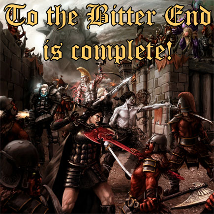 complete! I will endeavor to write some Hints for Chapter VI later, so if you're getting stuck, check back in a day or two. Chapters I-V have also seen some very minor updates and balance fixes, so feel free to get the the newest versions from the download page as well. 25-08-2008 Chapter VI is now at the playtesting phase! That means that all the actual map-making is now done. All I need to do is fine-tune the cinematics, fix any bugs I find, and if necessary, tweak the difficulty a little. Depending on how the playtesting goes, the map may be released in about a week or so, but again, I cannot make any guarantees - who knows what problems may crop up at the last minute? 29-07-2008 Two short updates: Chapter VI is now 80% complete. The last area still needs to be finished, and it's still needing tweaking and balancing, but things are looking good. Secondly, thanks to some feedback from a fan, I've found and fixed a bug in Chapter V that prevented Kitharsis' custom skin from showing correctly. I think this bug crept in with the last update, but the version uploaded here doesn't have that issue anymore. 11-07-2008 It has been some time since the last update to this site, so a new one is long overdue. Firstly: Yes, To the Bitter End is still an active project. I work on it for about an hour every day, and I am determined to get it finished. Secondly: The Administorum, the original inspiration for To the Bitter End, has closed. However, this in no way affects the To the Bitter End project, or my love for the Multiverse and its characters. To me, the Multiverse has always lived more in my mind and heart than at any website, and it will remain that way. Thirdly: Chapter VI is going well. The reason why there has been such a long delay is because of a huge and exhausting load of preliminary work that was required in order to start actually working on Chapter VI. This preliminary work - making and testing the custom units and abilities - took literally months. However, I have completed all this, and have been busily working on the map. The map itself is over 60% complete, and barring unexpected delays, should be fully done in a month or two. I hate making time estimates, but I'm fairly confident this goal can be met. Keep your eyes on this site and remain patient, Chapter VI will get finished! 30-10-2007 Work on Chapter VI is continuing at a steady pace. I'm currently working on a number of interesting new custom abilities and units that are proving to be rather time consuming, but are looking pretty good so far. 24-8-2007 Though I have been overseas for a while, I am now back. Work on Chapter VI has resumed and I've also uploaded new versions of Chapter I-V, which should hopefully fix a bug that became apparent in Chapter V. 22-4-2007 A new update to Chapters I-V is now