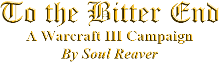 easier): Lastly, I've fixed a few spelling mistakes on the website, and also added yet another new character profile to the Manual: the brutal Awakened One, Maelstrom. 24-5-10 The last weekend was spent not only on the usual work for Chapter VIII, but also discovering a rather vicious bug in that Chapter that caused saved games to crash when loaded. Fortunately, after a brutal two-day battle, I can report victory - the glitch has been crushed and should not make an appearance when Chapter VIII is released. Chapter VIII is slowly but steadily becoming playable, and I have been playtesting various aspects of it already. I have also rearranged the Manual slightly, and, as promised last time, added a small bit of additional background information: a brief character profile for 'To the Bitter End's antagonist, Morganem. Further updates will follow. 1-5-10 I have recently been reminded that it's been some time since my last update, so it is about time to remind people that I am still amongst the land of the living. Work on Chapter VIII has been progressing, with a major hurdle just recently overcome, and with me getting more time to work on it lately. Furthermore, I've done pretty much all the 'boring' work, which certainly helps keep me motivated. As a small bonus I've added another section to the manual - specifically, it is the tale of Morganem's Rise to Power, and will finally let you all know how things came to be the way they are in the war-torn Plane of Ithia. More backstory updates may follow in the future. 17-3-10 Two images have been added to the Gallery page - both are the work of a very talented artist called Tom Hering. Thank you, Tom! 12-2-10 I've come back from overseas and have been slowly working away at Chapter VIII. However, it has been wisely suggested by someone that I append some sort of version number onto my maps. While I do not want to clutter up my maps with version numbers and instructions, I do see the value in this. So, while playing any newer TTBE map release, you can view its version number by typing in "version" (without quotation marks) into the chat window. This will display the version. If nothing comes up, then the map is older than version 0.7.01, and you might want to download a newer version from this site. The most up-to-date version number will always be listed at the top of the Download page, in case you need to check. In addition to the version numbers, the latest release also has a very minor bugfix and some spelling corrections. Now, back to work on Chapter VIII... 21-12-09 A number of rather major life events (purchasing and moving into my first house, getting engaged, and now an upcoming one-month overseas holiday) have made progress on Chapter VIII considerably more sporadic than I had hoped - I've been pretty much flat out dealing with these things for the past month or two, with only a few chances to really sit down and concentrate on working on To the Bitter End. However, I do want to reassure everyone that I am still around, and I am still working on Chapter VIII, and that progress is being made. The pace should pick up again considerably once I return from my holiday. 12-09-09 I have recently purchased a new computer, and it has taken me some time to set up everything on it. It is now up and running and work on Chapter VIII was set to continue. However, up until this reinstall, I had been using Warcraft III version 1.23. After this reinstall, and on installing the 1.24 patch, an error (due to some trigger changes) made it impossible for me to edit my own maps. Strangely enough however, they still remained playable with no apparent bugs or ill effects. Since the maps still play problem-free on 1.24, I've made no changes to the maps hosted online yet. I personally have also 'downgraded' back to 1.23 to continue editing - while I may address the issue in the future, it's not much of a problem if it does not affect playability, so it is not a high priority. However, should you experience any problems playing the maps using Warcraft III v1.24, please send me an e-mail (at meet_soul_reaver@hotmail.com) and let me know. 27-07-09 A new version of Chapter VII has been uploaded, which rebalances the final battle slightly, making it slightly more challenging. 17-07-2009 Another TTBE-inspired image has been donated by Chris Oldland - this time it is one of the dark Void Children. You can view it in the Gallery section of this site. 14-07-2009 A new version of Chapter VII has been uploaded, which (hopefully) eliminates a bug that could under certain circumstances prevent a door for opening for Clutchfiend/Cameron - the problem was caused by the 'Undying' enemies in the previous section, which previously could be bypassed without completely killing them. I have also added a Gallery section to the site - I received a fine piece of art from Chris Oldland, and felt that I wanted to show it off. Additional art may be forthcoming as well. Lastly, work on Chapter VIII has (slowly) been progressing. I have successfully managed to teach myself some new techniques that I had not been able to do previously, and some simple terrain planning and unit creation has been done. 12-06-2009 Strategies for Chapter VII are now available in the 'Hints' section. Furthermore, both the Manual and the Hints pages now have a handy Contents section, which will let you jump right to whatever topic you're after without breaking your scroll-wheel. 07-06-2009 Again, Chapter VII and all previous Chapters have been updated. This includes some small fixes to incorrect capitalization in some dialogue, as well as a fix for a bug that prevented music lists from remaining cleared at the end of certain cinematics. 01-06-2009 Chapter VII and all previous Chapters have been updated. This includes a bugfix for when characters are not transferred over from Chapter VI, which resulted in them having lower skill levels than they were supposed to. Furthermore, I have addressed a discrepancy between th